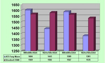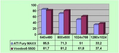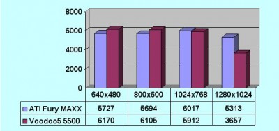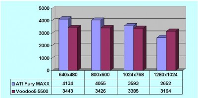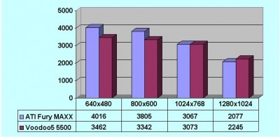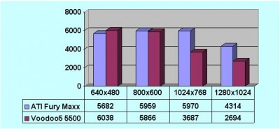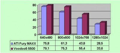Az ATI Fury MAXX 640x480 ill 800x600-as felbontáson mindenhol beelőzi az 5500-at.