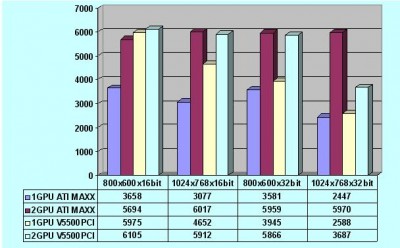 Az ATI Fury MAXX szinte hihetetlen többletet tudott kihozni magából a két GPU-val. 1024x768x32bit-en 144%-os a javulás. Ugyanitt a V5 csupán 43%-kal tudott több pontot szerezni két maggal, mint eggyel, de a többi értéknél is az ATI tudott jelentős növekedést elérni a két processzorral az egyhez képest. A 3dfx VSA-100-as chipje jóval erősebb, de kevésbé tudja kihasználni a két GPU-t és így kevés az a növekedés, amivel a MAXX-ot maga mögé tudná szorítani.
