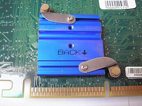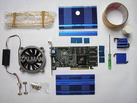 A szerelés a kártya gyári hűtőbordájának eltávolításával kezdődik. Ez nem egyszerű feladat, mivel hiába kerül eltávolításra a két rögzítő fémpöcök, a bordát egy erős, fehér színű kétoldalas ragasztóanyag fogja. Ezt csak egy vékony, széles pengéjű késsel tudtam eltávolítani. Érdekes módon a ragasztóanyag inkább a videochip (legyen ezentúl GPU az egyszerűség kedvéért, bár így csak a T&L motorral ellátott videóvezérlők megjelenésétől hívjuk a kártyák lelkét) szélét fogta meg inkább, a közepén nem maradt ragasztóanyag.