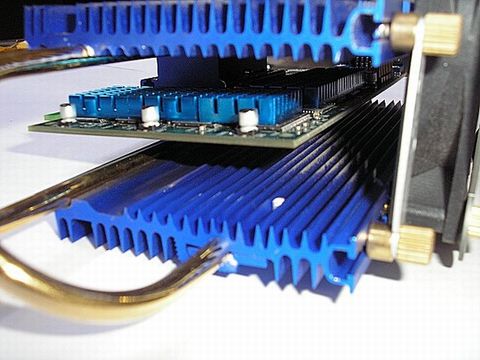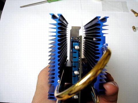 A végeredmény sajnos nem lett esztétikailag kifogástalan, mivel a blokkok elhelyezését nagyon szűk határok között tette lehetővé a GPU körüli lyukak pozíciója, így kicsit „csálé” lett a hűtő állása. Egyrészt a két nagy borda teteje eltérő magasságba került (kb. 3-4 mm), másrészt a két blokk nem ugyanazon a pozíción van a kártya két oldalán.