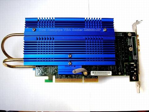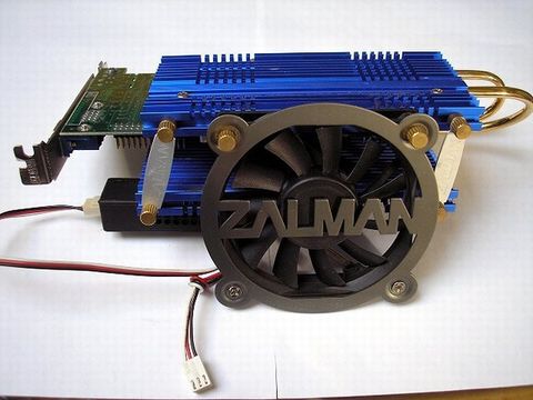 A kísérlet másik szereplője a Zalman ZM-HP80D dupla hőcsöves passzív hűtő, amelyet egy Zalman ZM-OP1 ventillátorral és leszabályozójával csendes aktív hűtéssé léptettem elő. Hogy miért ez? A válasz egyszerű: úgy gondoltam, hogy a V3 kártyára ez passzolhat, mivel a Voodoo kártyán megvan az a két lyuk a hűtő rögzítésére, ami előfeltétel a Zalman borda alkalmazásának. Hogy aztán a két lyuk pozíciója megfelel-e a követelményeknek, később kiderül.