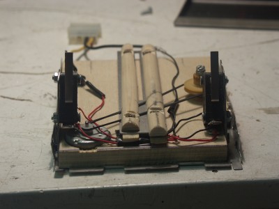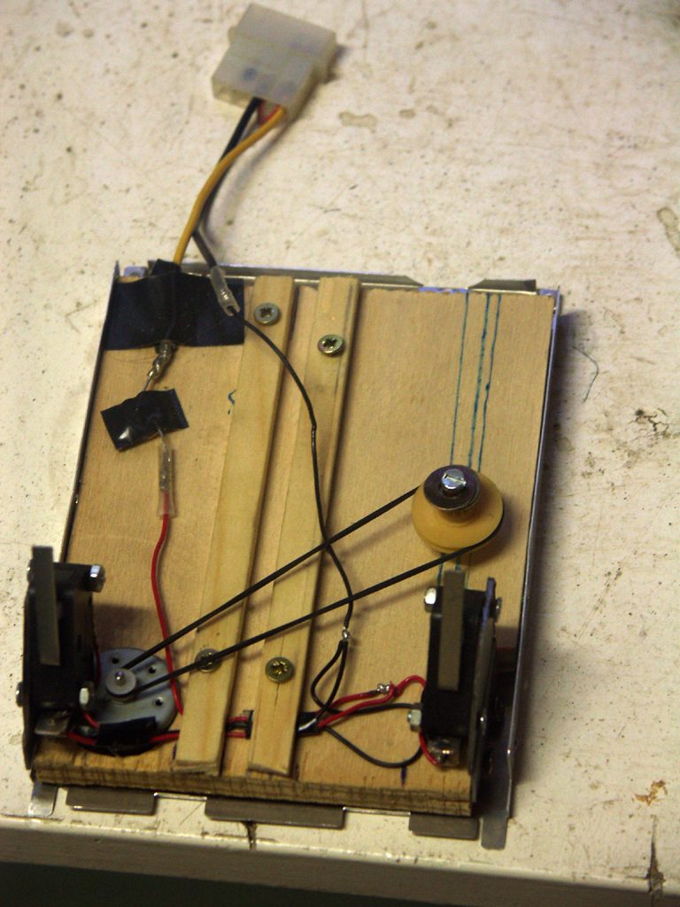 A fém keretben lévő fa alap épp becsavarozható egy FDD meghajtónyi helyre, a fiók hátulsó része a szervó felől előrenyúló (sárga-kék matricás) rúdhoz rögzítődik, előrébb pedig a középen, a fán fekvő gördülősínhez.
