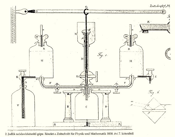 "A szénsav gáz fejlesztésére szolgáló első edénybe beleöntjük a vízzel higított kénsavak bizonyos mennyiségét. Ezután porrá tört krétát, őrölt márványt, vagy ami sok tekintetből jobb szitált fahamut annyi vízzel keverjük össze, hogy folyékony pépet alkosson, és ezt ugyanabba az edénybe nyomjuk egy erre a célra való dugattyúval. Az edényt légmentesen lezárjuk. A hamunak többször megismételt adagolásával a szénsav gáz az első edényből átnyomul a másodikba. Ez a második edény a szódának vagy hamuzsírnak oldatát tartalmazza, amely a gázt a ne talán magával szállított kénsav gőzöktől megtisztítja. Az így megmosott és sűrített szénsav gázt, egy csap megnyitásával tetszés szerint lehet csövön keresztül átereszteni egy harmadik hengeres edénybe, amelyben a telítésre szánt víz van." Írja Jedlik, az első szóda receptjét.