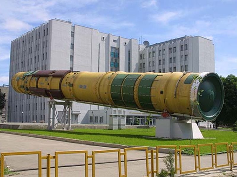 Egy R-36 rakéta teste szoborként kiállítva a Juzsnoje tervezőiroda épülete előtt