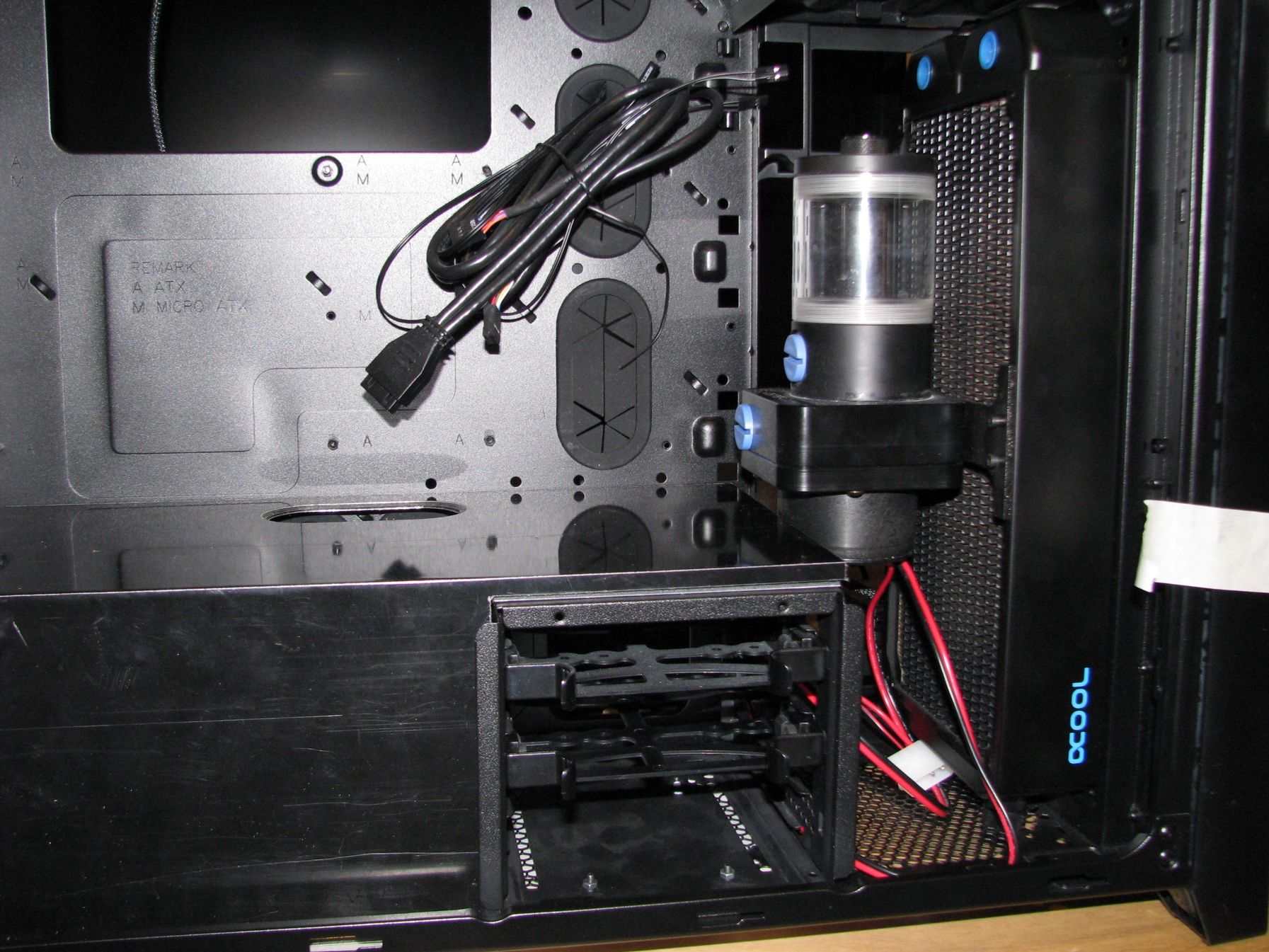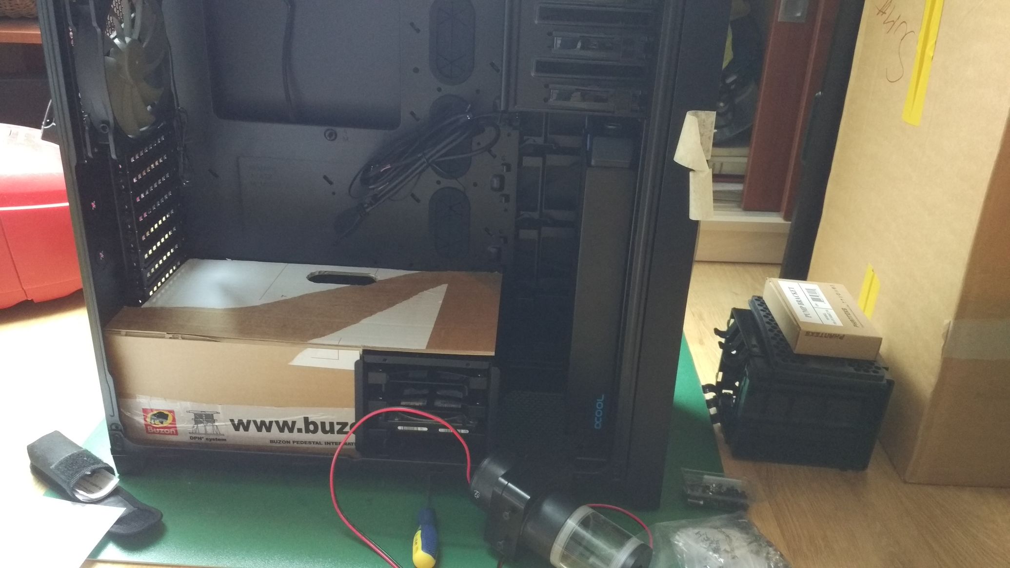 Jött az új gép és az új ötletek. Áttértem lga 2011 foglaltra. A proci – tuningolva – nem az alacsony hőtermeléséről híres, ezt megdobtam egy r9 390-nel, meg ugye az alaplap is bekerült a körbe. Mindezt terhelésre, levegővel hűtve egy felszállás előtt álló helikopter zajával jutalmazta kész rendszer. Persze itt is sikerült beválasztanom a Phanteks Enthoo Pro M házzal, mert nem fértem el benne, ha megtartom az optikai meghajtót. Így jött egy Corsair 750D High Airflow ház, de ezt is átszabtam egy kissé. Így már jöhetett a víz.