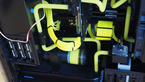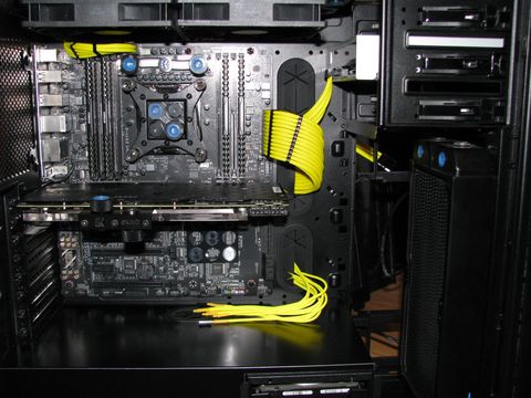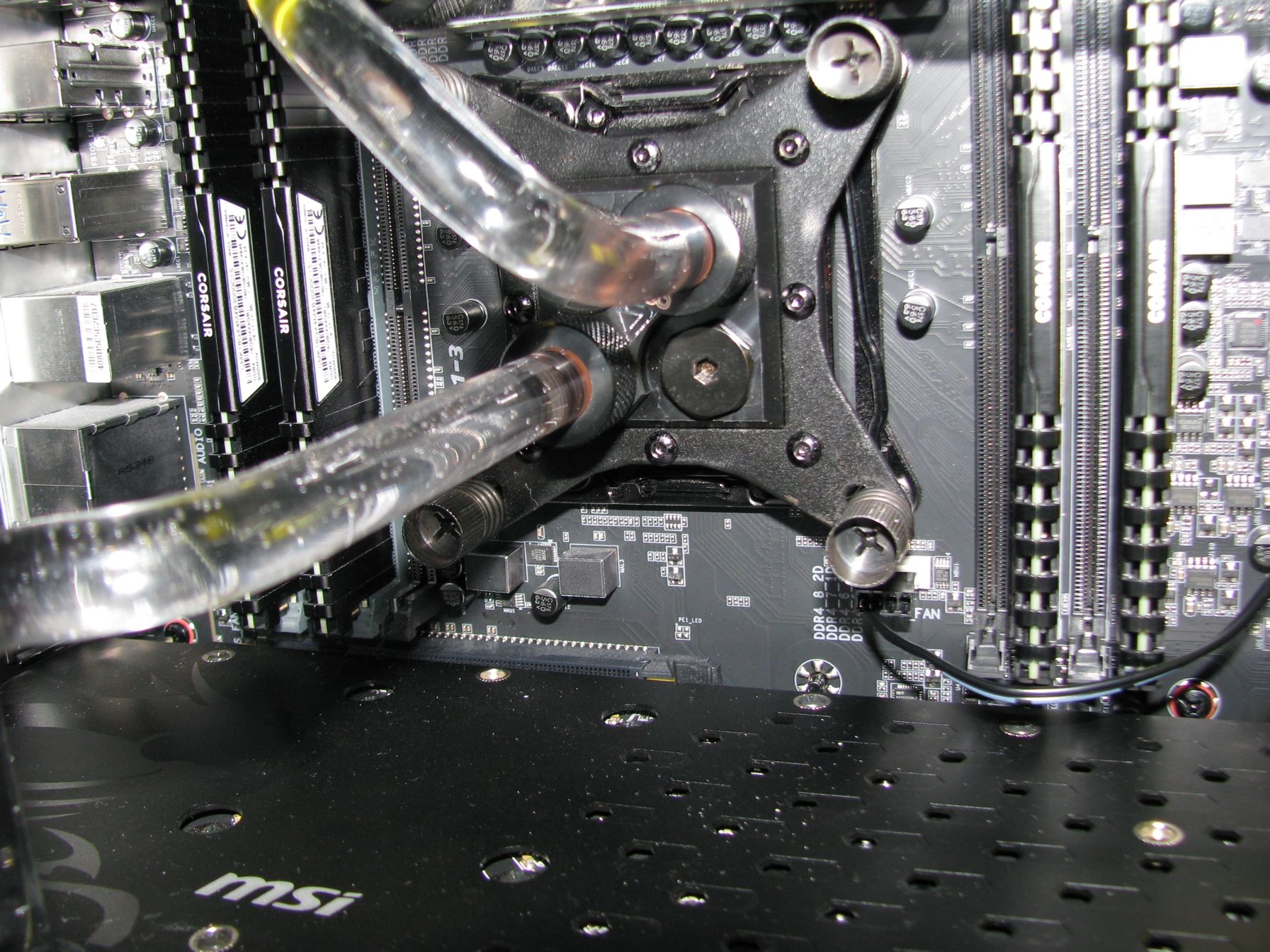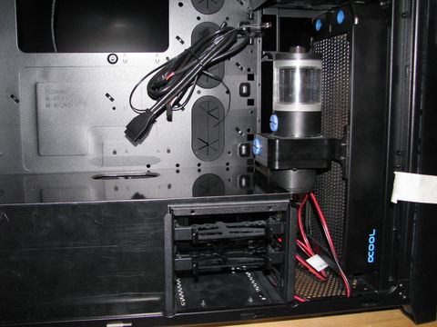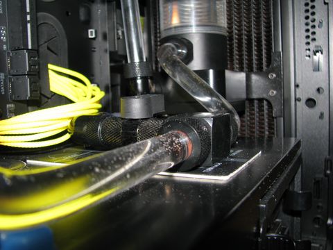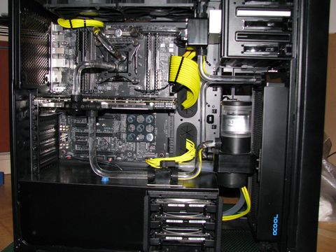 (Mint az első vizes rendszernél itt is sikerült elárasztanom a gépet. Csak míg az elsőnél 2 ventilátor fürdött meg a desztvízben, addig itt a vga és az alaplap. Kb 1 deci beöntött folyadék távozott vesztesség mentesen a rendszerből. A hibát egy rosszul berakott csőnek köszönhettem, mert nem volt rendesen betolva a fittingbe. Szerencsére a desztvíz nem okozott galibát, csak 2 hét kényszerszünetet.)