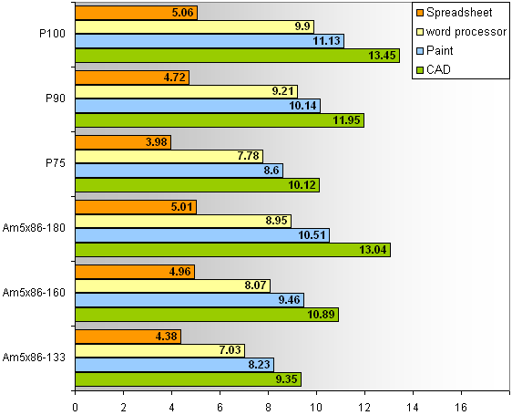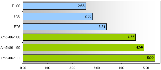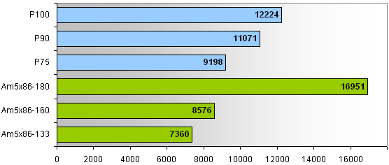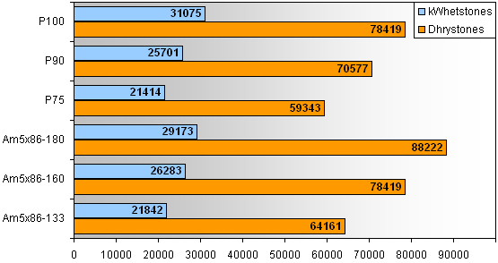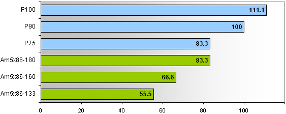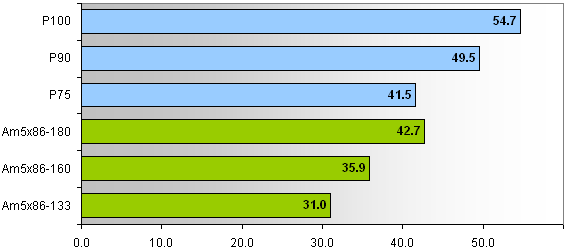 A szintetikus tesztek többségében az 5x86 és a P75 között nincs nagy különbség. Komoly különbséget két helyen láthatunk. Corespeed alatt a merevlemez sebessége egyértelműen az FSB-hez köthető, ennek köszönhetően 180MHz-en az AMD üdvöskéje szépít a 133-as és 160-as sebességen. A 3dBench eredmények szerintem a memóriaátvitel és az FPU számlájára írhatóak. A Pentium 75MHz-en olyan gyors, mint a tuningos 5x86 180MHz-es.