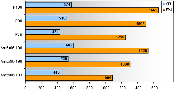DOS alatt a 486-os teszteket vettem elő. A tesztek nagy része szintetikus, de akkoriban még nem létezett fraps... Sokáig használtam - Win 95 alatt is - 5x86-ot, ami 160 MHz-en alkalmas volt mp3 hallgatásra és CD írásra. Ráadásként stabilabb volt, mint a következő 6x86-om. Arra számítottam, hogy a tesztek nagy részében képes lesz tartani a lépést a Pentiummal, kivéve ott, ahol csak az FPU számít. Lássuk az eredményeket.