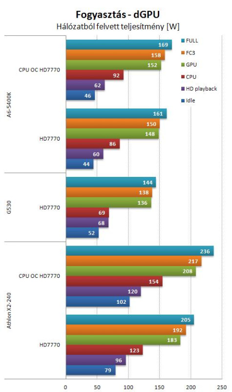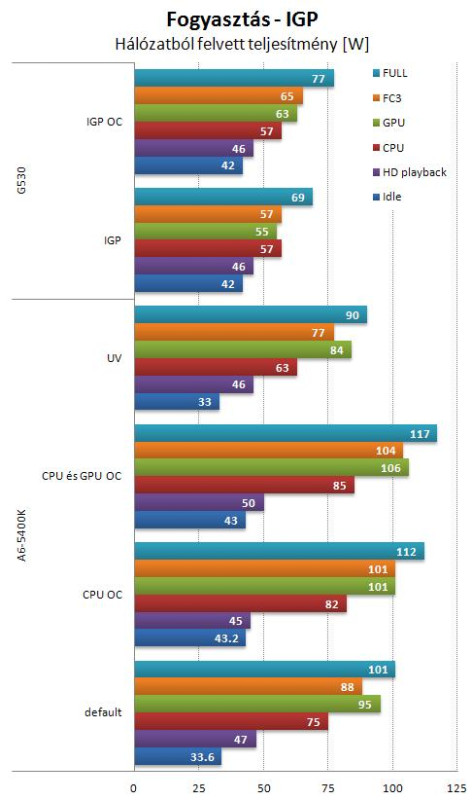 Az AMD processzorok a P4 korszak óta általában többet fogyasztanak, mint az Intelek. Egy modullal, de erős IGP-vel kérdés, hogy ez hogyan alakul. Az összevetés nem korrekt, mert az APU alá egy alsó kategóriás, míg a Celeron alá egy sokkal jobban felszerelt lap került. Ráadásul a tápegység is különbözött, elvileg a pár éves VX450 hatásfoka rosszabb A 400-as FSP APN-nél. Mindezek ellenére nagyságrendileg össze lehet vetni a két processzor fogyasztását. Ráadásnak bekerült az X2 is és az alulfeszelt A6 is. Érdemes elgondolkozni azon, hogy minek ad gyárilag 1.45 V-ot a turbó, ha elég 1.2 V is.