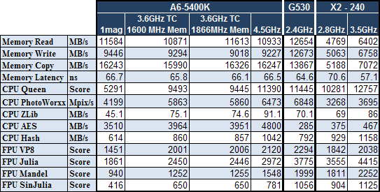 Az Aida64 eredmények nagyon vegyesek. Az 5400K eredményeit nézve látható, hogy az 1600-as és 1866-os memória között nincs sebességkülönbség a CPU és FPU tesztekben. A single channel viszont már érezhetően visszafogja a gépet. A Celeronnal összevetve a CPU AES és HASH teszteket leszámítva gyengébb az APU. Az öreg X2 eredményei vegyesek, hol jobbak, hol gyengébbek, de tuningolva nem mondhatóak rossznak.