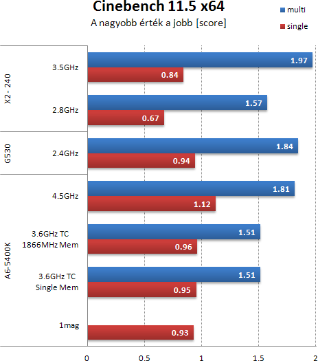 A Cinebench nem érzékeny a memória sávszélességre, de az APU-t tuningolva szépen gyorsult. A Celeronnal összevetve érdekes az eredmény. Az 5400K egy szálas teljesítménye jobb, mint a G530-nak. Ez köszönhető a magas órajelnek. Az is látható, hogy a két teljes mag sokkal jobb, mint egy modul, de a Celeron nem tuningolható, úgy pedig már fej-fej mellett fut a két processzor. Az X2 eredményei érdekesek. A single thread annak a számlájára írható, hogy a Windows oda-vissza dobálta a feladatot a két mag között és itt még nincs közös cache, mint az újabb daraboknál. Kézzel állítva az affinityt már 0.81-et kap alap órajelen. Tuningolva szép a több szálas eredménye, kérdés, a többi tesztben hogy fog viselkedni.