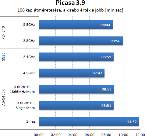 Picasaban feladtam a leckét a gépnek. 108 elég nagy felbontású képből kellett albumot generálni. 1 modullal gyenge az APU teljesítménye. A memória sávszélesség növelése nem gyorsítja a feladatot, de a tuning igen. A G530 tudását alapjáraton hozza az 5400K. Az X2 végre nem marad le végzetesen, overclock nélkül ugyan lassabb, de nem radikálisan, míg húzva beéri az alapon futó másik két procit.