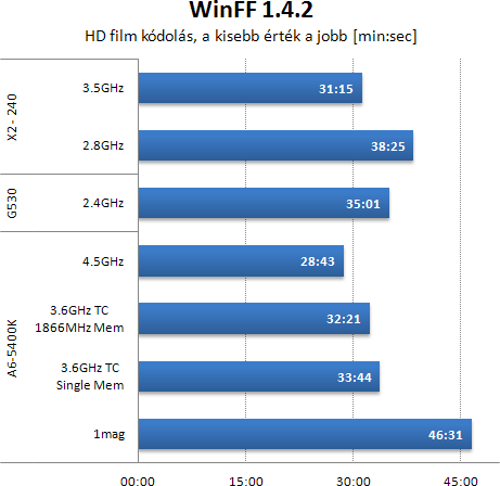WinFF-el HD kódolást végeztem. Ez a teszt azért is jó, mert a bizonytalan overclock rendszerint kibukik alatta és nagyon jól skálázódik a magok számával. Az eredmény ismét a szokásos. Az APU két maggal gyorsabb, mint eggyel, a sávszélesség csökkentése mérhető, de nem radikális. A tuning hatására elég szépen gyorsult a gép. A Celeront ebben a tesztben sikerült szépen legyőzni. Az X2 ismét a leggyengébb, de nem vészes a különbség.