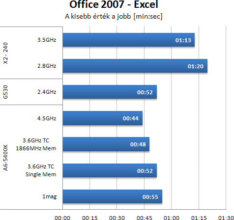 Excelben az AMD APU eredmények szép sort alkotnak. A memória sávszélesség, két mag már elég a Celeron legyőzéséhez. Erre egy lapáttal rátesz az overclock. Az X2, akárcsak az előbb, ismét lemarad. Nem is kicsit. Érdekes lett volna egy L3 cache-el ellátott Phenom X2-t bevenni a tesztbe. Esetleg jobb DDR3-as alaplap is dobna az eredményen, de régi teszteknél sem igen ment 1 perc alá az eredmény, még keményebb tuninggal sem.