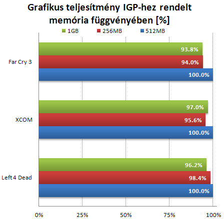 Kíváncsi voltam, hogy az IGP-nek kiosztott memória mennyisége mennyire növeli, vagy éppen csökkenti a teljesítményt. A teszteket alap órajelen, 1866-os memóriával futtattam le 256, 512 és 1024 MB RAM mellett, amiből a középső a BIOS default, ezért ezt vettem 100%-nak. Az átlagok alapján nincs radikális eltérés, de a gyári beállítás teljesít a legjobban, de érdemes megnézni a késleltetési görbéket is, mert az átlag sok mindent eltakarhat.