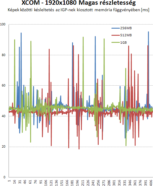 Az XCOM is meghálálja a nagyobb memóriát. A játék alatti megfigyelés a görbén jól látható. 1GB-tal lehet a legsimábban görgetni a képet. Az animációk is sokkal simábbak, mint 256MB-tal, de 512-höz képest már nem nagy a javulás. Észrevehető, de nem jelent igazi különbséget.