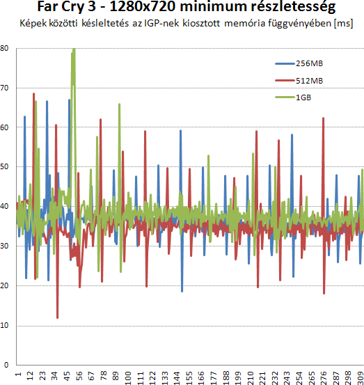 Far Cry 3 alá is elkel az 1GB, de teljesen mindegy, mert egyik beállítással sem élvezhető a játék. Furcsa, de 1 GB-tal ugyan simábban fut a játék, de alacsonyabb is az átlag.