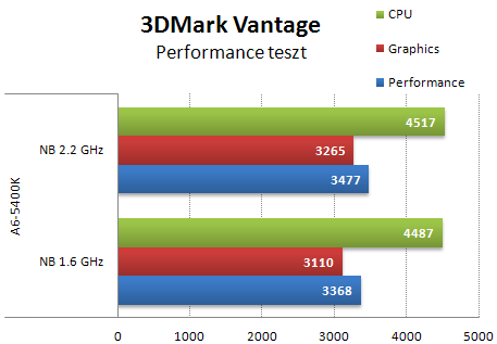 Vantage alatt a GPU tuning számít a legtöbbet, de a CPU órajel emelése is dob az APU pontszámán. A Performance eredmények, amit általában megadnak az emberek, de érdemes nézni a CPU-t is. A G530 CPU-ban erősebb, de grafikában lemarad. Az alapon futó APU harmadát futja meg kb. tuningolva, alapjáraton még gyengébb.