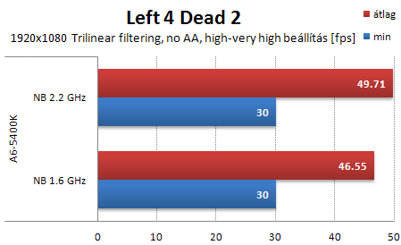 Left 4 Dead 2-ben feltekertem a felbontást és a részletességet is a maximumra és 8x anti aliasingot állítottam be. Ezek ellenére egyértelmű a CPU limit. A Celeron simán viszi a pálmát, sőt a tuningolt Athlon X2 is meg tudja előzni a kis APU-t. Mindenesetre a leggyengébb is kényelmesen játszható még multiban is.