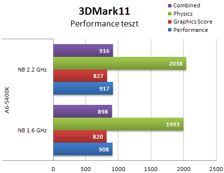 3DMark 11 alatt a Celeron nem indul, nem tudja a DX11-et futtatni. Az APU is leginkább képregényt mutat, de lefut a teszt. A pontozás nagyon GPU függő a Physics tesztet leszámítva. Nagyon szépen látható, hogy 950 MHz-en mennyit javulnak a pontok.