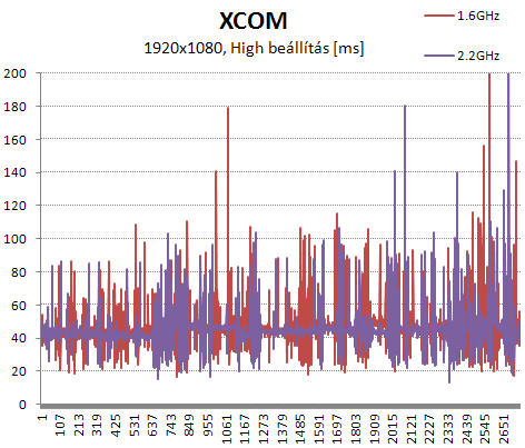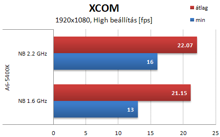 Az XCOM érdekes program. Ugyan GPU limites, de a CPU órajelének emelése jót tesz a görgetés folyamatosságának. Mivel nem felvett benchmarkot játszottam vissza, ezért a minimum értékek nem annyira konzisztensek, de a 20 perc játékidőnek köszönhetően az átlagok igen. Celeronnal tuningolva már nem okoz gondot a kezelés, de a játékélményt erősen csorbítja az animációk ugrálása.