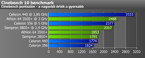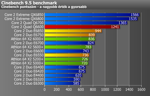 Cinebech 9.5-re még mindig igaz az hogy órajelre épít, minél több annál jobb. Az új, 10-es verzióhoz még elég kevés eredmény van a neten, de itt is igaznak tűnik a 9.5-re leírt állítás, lévén hogy 10 pont a különbség a 6400+ és a 3200MHz-es 4400+ között. A PH!-s egymagos eredmények….arra jók hogy lássuk tényleg van gyorsulás a több mag hatására.