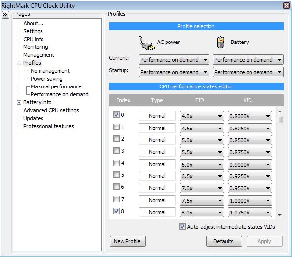 Az alábbi képeken RMClock fontosabb beállításait láthatjátok (legalábbis azokat amelyekkel én babráltam), ezeket az beállítás-oldalakat a programon belül a baloldali listából érhetjük el.