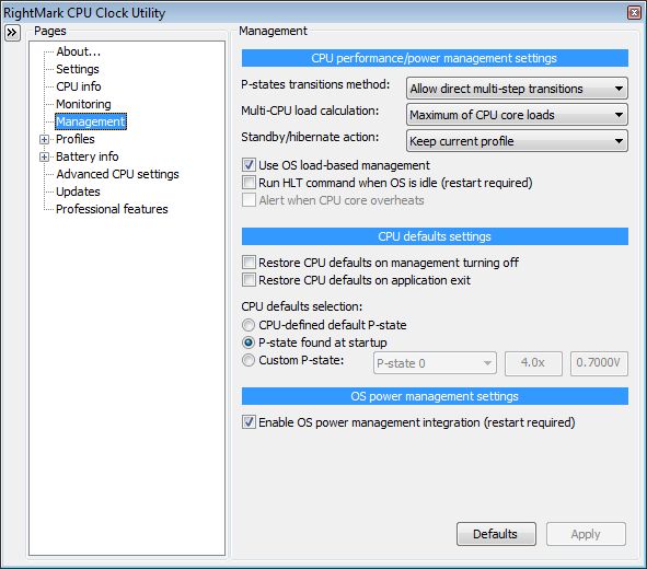 A felső két oldalon kívül fontos lehet még a "Management" oldalt is áttanulmányozni (2.3). Itt a terhelési szint meghatározásának módját választhatjuk ki többmagos és többprocesszoros rendszerekben ("Multi-CPU load calculation"), valamint azt, hogy a teljesítménylépcsők közötti váltás egy vagy több lépésben történjen ("P-states transitions method").
