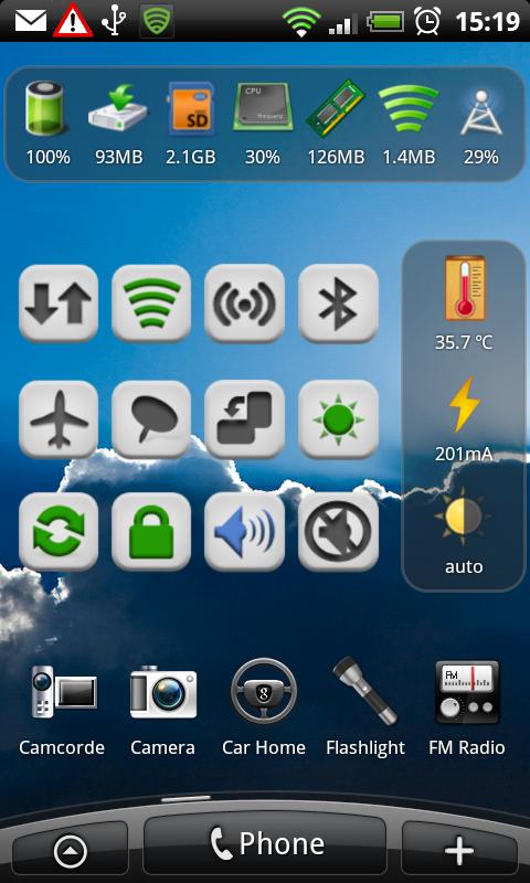 Ezermillió-féle widget. Bármit bárhogyan be tudsz állítani a segítségével, rengeteg lehetőséged van arra, hogy minél testreszabottabb legyen az androidos telefonod. A legtöbb widget mérete állítható, be lehet állítani tetszés szerint a widget színét, még óra widget is van benne. Néhány dolog, amit állítani lehet vele: 2G-3G, APN, WiFi, Bluetooth, GPS (rögtön bekapcsolja, nem a beállítási oldalra visz!), szinkronizálás, Lock screen, és még rengeteg egyéb lehetőség. Nagyon praktikus, ha nem akarsz minden egyes alkalmazáshoz külön widget után nyomozni.
