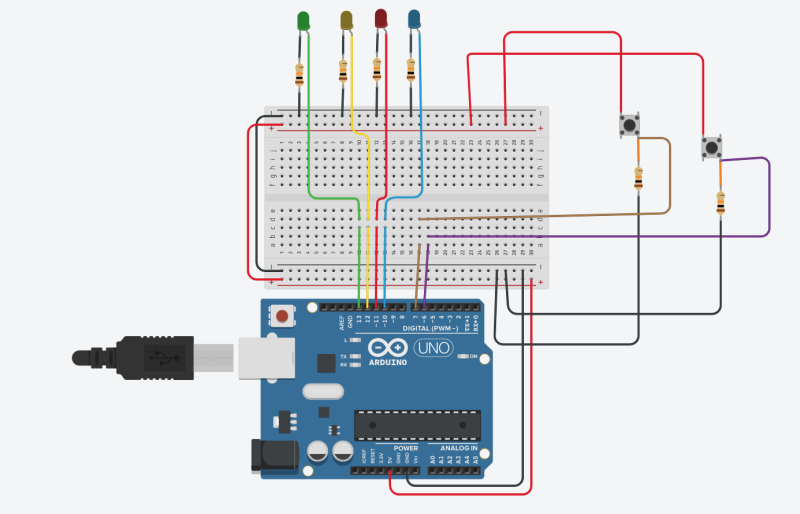 Akkoriban csak egy Arduino Uno-m volt, nem voltak még hozzá LED-ek, gombok, egyéb alkatrészek, így a Tinkercad nevű online áramkör tervezőben készítettem el a beadandót az oktatóm javaslatára. Ebben az áramkört és a programkódot is meg tudtam tervezni és szimulálni is lehetett a működést.