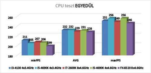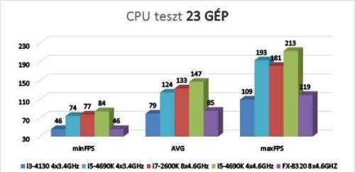 Itt már teljes a szétszóródás. A sok autó miatt megizzadnak a hardverek. Érdekes, hogy mekkora eltérés van a 4600 MHz-es FX 8320 és a 4600 MHz-es 4690K között. Később biztos javítanak majd rajta valamit KUNOS-ék, mert ez így nagyon kellemetlen. Az i3, mely olcsóbb, lényegében csak 2 magos, s több mint 1 GHz-cel kisebb órajelen megy, szorongatja az AMD processzorát (ez nem mutatja hűen a teljesítménykülönbséget, BF4 alatt pl. az AMD szorongatja a 2600K-t azonos órajelen...).