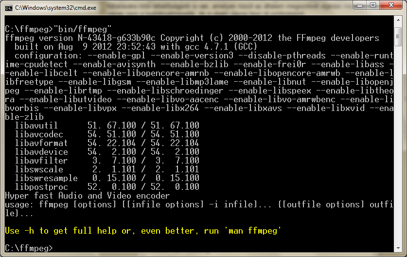 2. a következő paranccsal elindítom az ffmpeg programot: "bin/ffmpeg"
