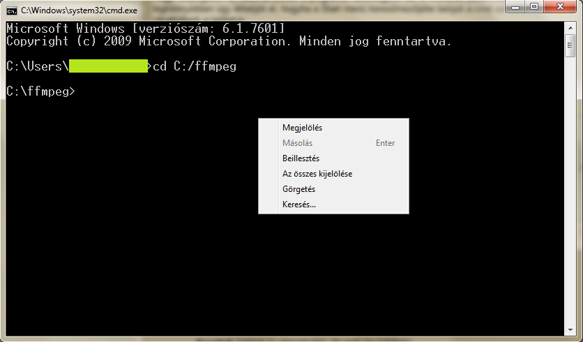 1. átváltok az ffmpeg könyvtárába (ne felejtsük el, hogy egyszerűsítettem az elérési útvonalon, ahogy az előző fejezetben leírtam), mely a következőképpen történik: cd C:/ffmpeg