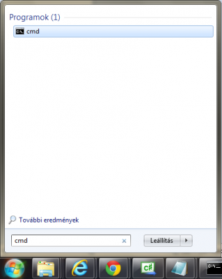 Ahhoz, hogy ténylegesen is használhassuk a programot, szükségünk van a Windows parancssorára. Ezt legkönnyebben úgy érhetjük el, hogyha a Start menü keresőmezőjébe beírjuk a cmd szavakat és rákattintunk a találatra: