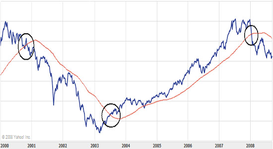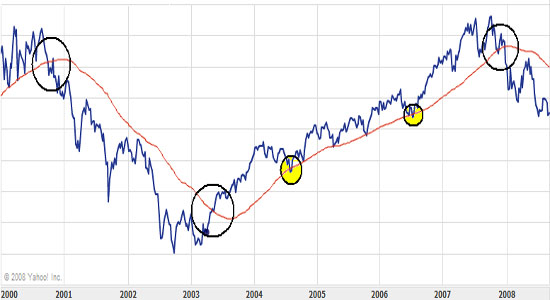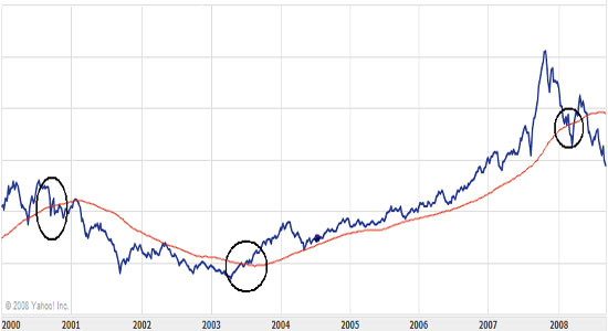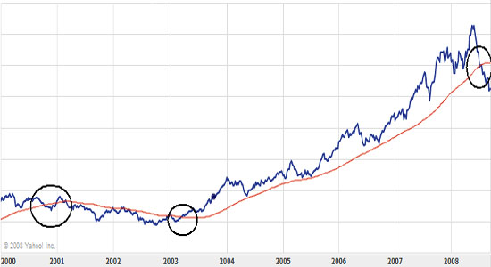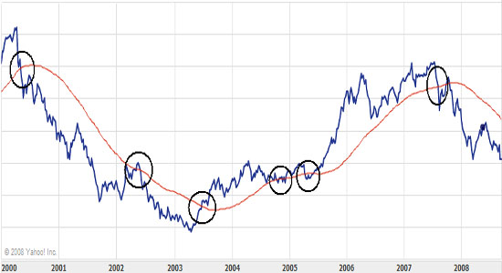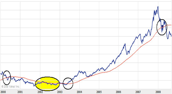 A szabály tehát a következő: venni kell, ha a 200 napos mozgóátlag az árfolyam/index értéke alá kerül, és el kell adni, ha fölé kerül. Namost mivel ezzel a szabállyal rengetegen tisztában vannak, ezért sokszor előfordul, hogy amikor a részvény/index eléri ezt az értéket, elkezd erősen ingadozni az árfolyam/pontszám, éppen ezért én azt javaslom, hogy hosszútávú befektetéseink során ezt a szabályt inkább a 300 napos mozgóátlagra alkalmazzuk (természetesen nem kötelező), vagy bonyolíthatjuk úgy is, hogy pl. 200 nap +-10% (ez nem is rossz ötlet, mert ha a 200 napos mozgóátlag alatt vagyunk 10%-kal az már komoly figyelmeztető jel), csak ez nagyobb odafigyelést igényel.