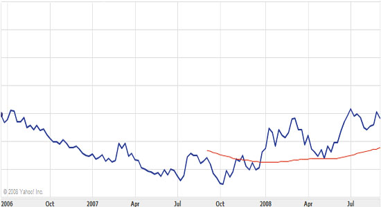 Itt a Nikkei 225 index teljesítménye 2000-től napjainkig, a grafikonon a piros vonal mutatja a 300 napos mozgóátlagot, karikával jelöltem a vételi és eladási pontokat. Látható, hogy ha akkor vettünk, amikor a mozgóátlag az index értéke alá került, és akkor adtunk el, amikor a mozgóátlag az index fölé került, akkor szinte mindig nyertünk. Persze létezhetnek olyan pontok, amikor éppen a tetőponton vettünk (2002), de ha később az újabb keresztezésnél eladtuk a befektetési alapot, akkor csak minimális veszteséget szenvedtünk el. Különböző fórumokon sorra bukkannak fel azok az emberek, akiket tavaly-tavalyelőtt rábeszélték kínai/india befektetésekre, és most bosszankodnak, mert nem adták el a befektetést időben, és már 30-40%-os vagy még több mínuszban vannak. Ezt mint látható el lehet kerülni.