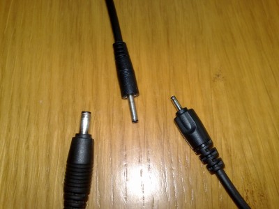 A feketeleves, hogy a töltőfej nem szabványos. A képeken látható a saját töltője (középen), illetve egy vastag Nokia (bal oldal), és az "új" szériás vékony Nokia (jobb oldal), igazából utóbbi egy átalakító vége (ezért ilyen vastag a kábelezés), de ez most nem lényeges. A vastag 3.5mm, a headseté 2.5mm, a Nokia pedig 2mm. Sajnos a vékony Nokiával nem tölthető (próbáltam).