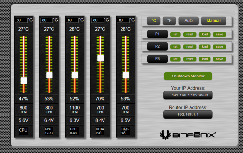 A menüben csak 1, 2, 3, 4, 5 számmal mutatja a ventilátorokat, de, mivel böngésző alapú a menü, így nem nehéz átvariálni egy kicsit a kezelőfelületet a kedvünk szerint, én például a számokat kicseréltem feliratokra, hogy pontosan tudjam, melyik csuszka melyik ventilátort állítja.