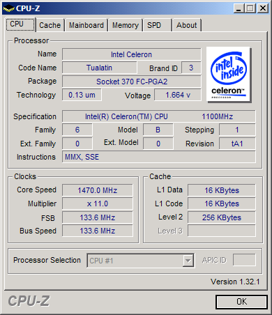 A BH6 1.01 sajnos csak 133MHz-es FSB-t támogat. Ezzel az 1100-as Celeron 1466MHz-en, az 1200-as 1600MHz-en futhat. A második már a Tua határait súrolta, ezért az 1100A-nál maradtam. Az újabb alaplapoknál, mint akár a BH6 1.1, vagy egy Asus P3B-F több lehetőség van a 140 és 150 MHz-es FSB-nek köszönhetően. A processzor 1470 MHz-en teljesen stabilnak bizonyult és az alaplap is jól viselte a tuningot. A processzornak 1.45V helyett 1.65V-ot adtam, amit még hosszabb távon is elvisel jó hűtés mellett.