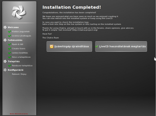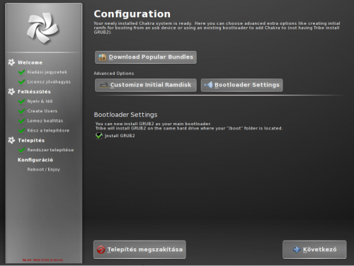 A telepítés után lehetőségünk van megmondani, hogy kérjük-e a GRUB2 rendszerbetöltő telepítését (igen, kérjük) a /boot mappát tartalmazó partíció merevlemezére (alapból ez az a merevlemez, ahová telepítettük a Chakrát), valamint Bundle csomagokat is letölthetünk, de azzal ráérünk az első boot után is.