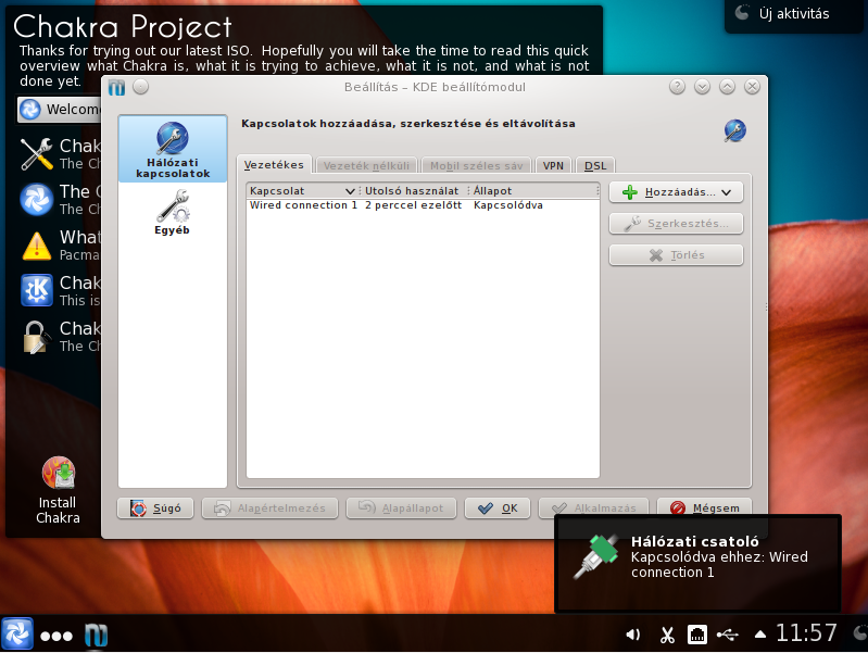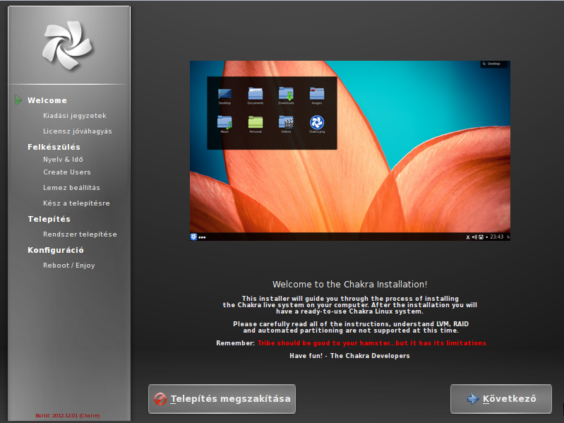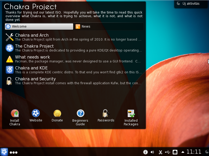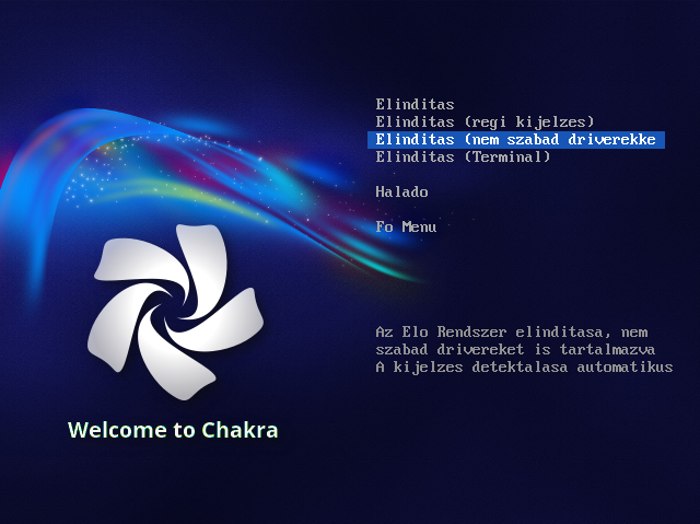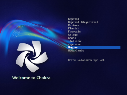 Itt az elején érdemes elmondani, hogy a Chakra lemezkép fájlja (.iso) egy úgynevezett Live iso, ami azt jelenti, hogy ha beteszed a gépbe és elindítod a betöltést, ekkor el fog indulni maga a Chakra Linux a lemezről, ami lehetővé teszi, hogy kipróbáljuk a disztrót. Ez azért is jó, mert ha valami eszközünk nem Linux kompatibilis, vagy valamilyen gond lenne vele, az jó eséllyel már itt kiderül, mielőtt még bármit tennénk a számítógéppel.