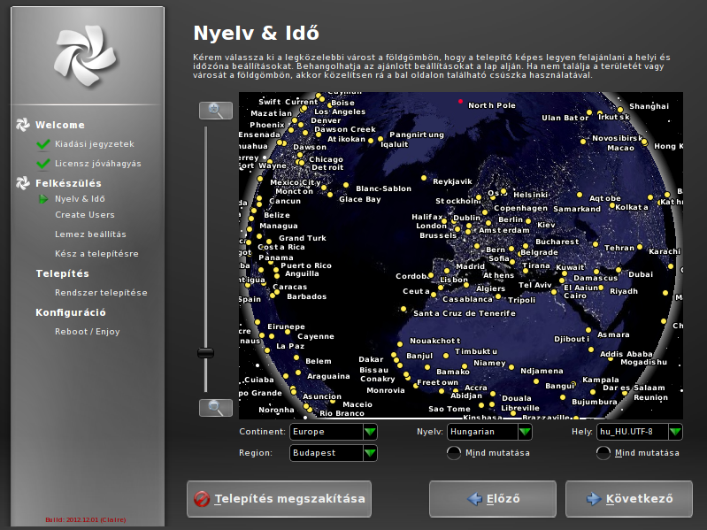 Túlélve az előbbi megrázkódtatást, jön az időzóna beállítása. A földgömb forgatható, lehet ráközelíteni és kézzel kijelölni, vagy szimplán csak kiválasztani az időzónánkat a listában.