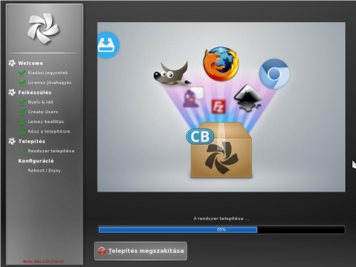 Így néz ki a bebootolt live rendszer (ezen az oldalon lévő képek technikai okokból 800*600-as felbontásban készültek, alapból nagyobb felbontásban indul a telepítő. Az érdekes zöldes betűszín is innen van):