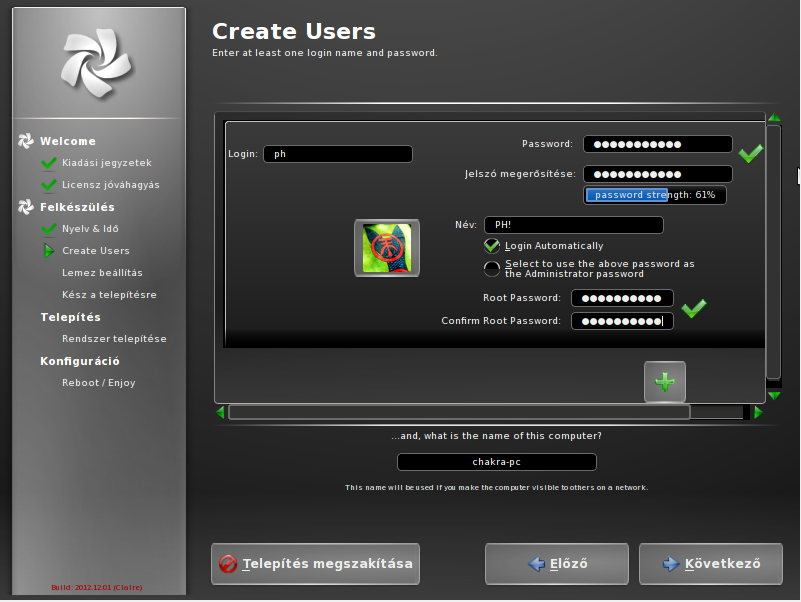 Következő lépésben a felhasználót, felhasználókat adhatjuk hozzá, választhatunk ikont magunknak, mutatja a jelszó erősségét és eldönthetjük, hogy legyen-e automatikus bejelentkezés vagy esetleg azonos jelszó a root felhasználónak.
