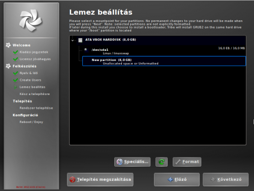 Természetesen ha szükséges, a későbbiekben bármikor létrehozható és felcsatolható egy tetszőleges méretű swap partíció.