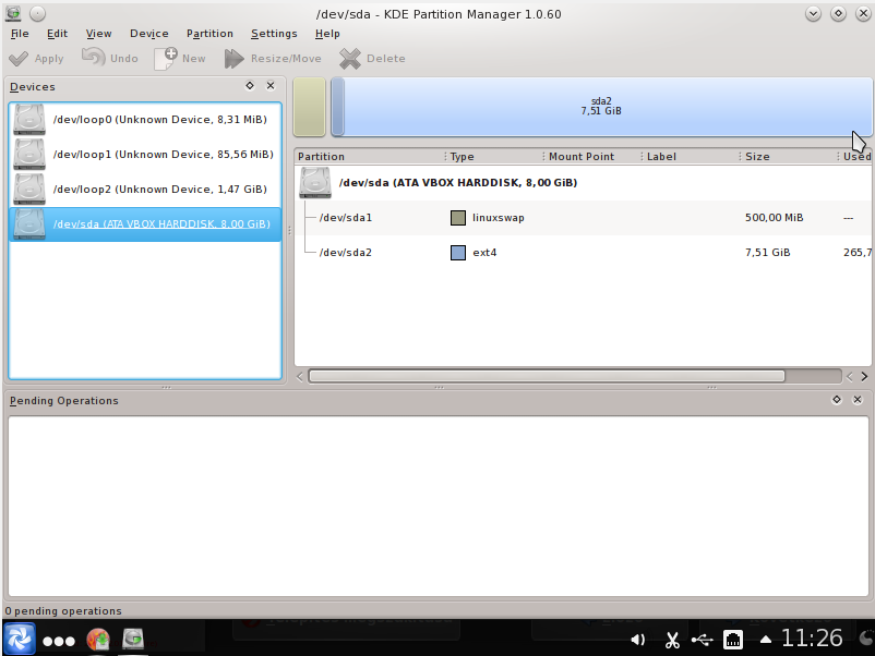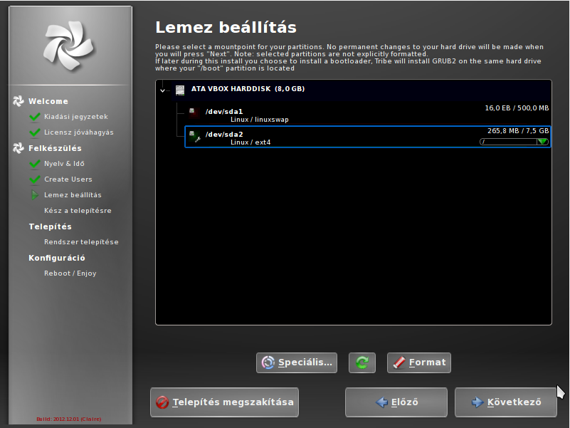 Amint megcsináltuk a partícióinkat és kiléptünk a Kparted programból, jelöljük ki azt az egyet, amire telepíteni szeretnénk, ez a root partíció, vagy egyszerűen csak "/". Fájlrendszernek javaslom az EXT4-et használni, swap partíció meg többnyire szükségtelen.