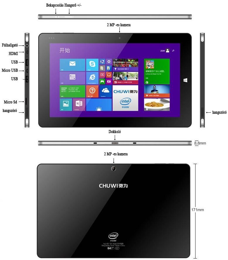 Csatlakozók: 2xUSB 2.0, micro usb, micro hdmi, 3.5 jack