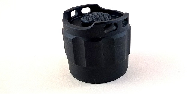 A zárókupak sem tartogat túl sok izgalmat számunkra. Benne egy rézgyűrűvel van rögzítve a forward clicky típusú kapcsoló, amit a lámpa legvégén egy sima fekete gumi nyomógomb rejt. Szerencsére a nyomógomb körül körbefutó peremet egymással szemben két helyen is bemélyítette a gyártó, így nem csak a kapcsoló típusa lett "taktikai", hanem a kialakítása miatt is rá lehet mondani ezt a mostanság divatos jelzőt.