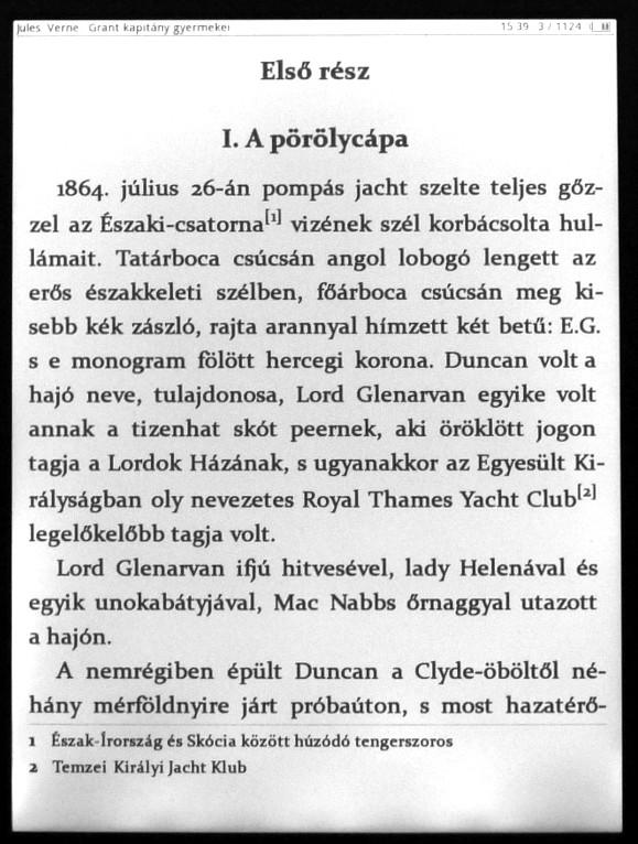 EPUB: Megfelelően elkészített és formázott könyv esetén közel ugyanazt tudja, mint az fb2 - a lábjegyzeteket leszámítva. Képes a beágyazott betűtípusok használatára is. Az epub belső formázásait valószínűleg nem kezeli tökéletesen, de az általam vásárolt vagy saját anyagból konvertált könyvek esetén ez eddig különösebb kényelmetlenséget nem okozott. Egy korlát mindenesetre van, sajnos DRM-el védett epub-ok megnyitására nem képes.