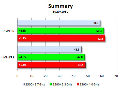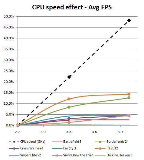 Az első grafikon az átlagos fps-ek alakulását mutatja. Egy pillantással felmérhető, hogy a 8 tesztalanyból 6 esetében a CPU órajel emelése alig van hatással az átlagos fps-re, a 2.7 GHz és a 4 GHz közötti majdnem 50%-os órajel-emelés kevesebb, mint 5% sebesség-növekedést hozott. A Borderlands 2-ben és az F1 2012-ben ezzel szemben a 15%-ot közelíti a gyorsulás, és ebből az első lépés hoz kb. 10%-ot.
